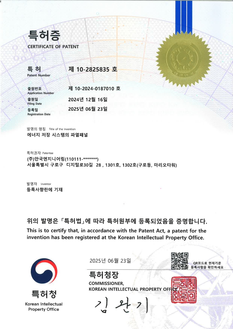 25년 06월 특허등록(에너지 저장 시스템의 파열패널) 유나희 0 85 11.04 09:20 2025.11.04 09:20 특허증 제 10-2825835호에너지저장시스템의 파열패널_25.06.23.pdf (160.3K) + 1 2024년 12월 16일 특허 출원 및 2025년 06월 23일 특허 등록을 완료하였습니다. 특허증 제 10-2825835호(에너지저장시스템의 파열패널)특허 번호(제 10-2825835호) / 출원 번호(제 10-2024-0187010 호)/ 발명의 명칭(에너지 저장 시스템의 파열패널)